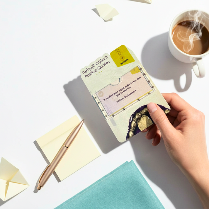 نقدّم مفكّرات وبطاقات ملهمة صُممت لتكون جزءًا من يومك، تساعدك على تنظيم أفكارك ونشر الإيجابية بأسلوب بسيط وهادئ. نؤمن بقوة الكلمة وأثرها، لذلك نختار منتجاتنا بعناية لنمنحك تجربة تحمل معنى وقيمة حقيقية.
